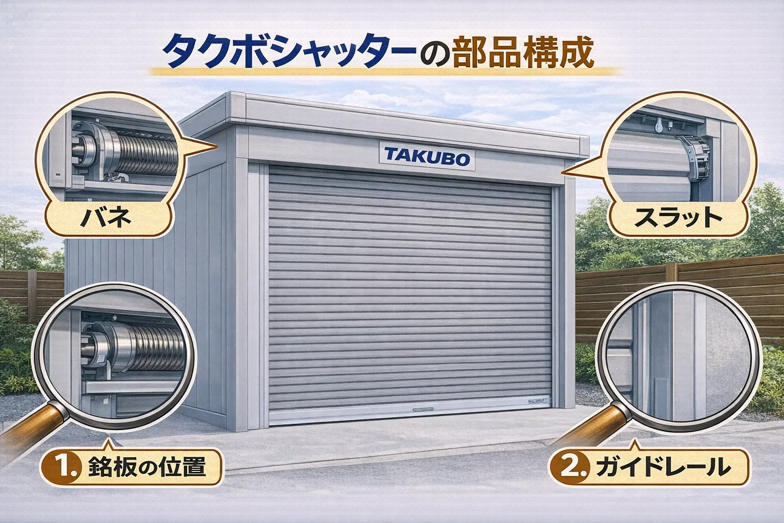 両メーカーの最大の共通点は、ガレージ本体とシャッターが一体化した設計です。つまり、シャッターの故障時は、シャッターケース、バネ、スラット、ガイドレールなどの部品を個別に交換する部分修理が中心となり、シャッター全体の交換は稀です。この点で、ウインドー用の小型シャッターとは大きく異なります。ただし、シャッターの規格はメーカーごとに異なるため、タクボとイナバの部品を相互に流用することは基本的にできません。以下では具体的な違いについて解説します。