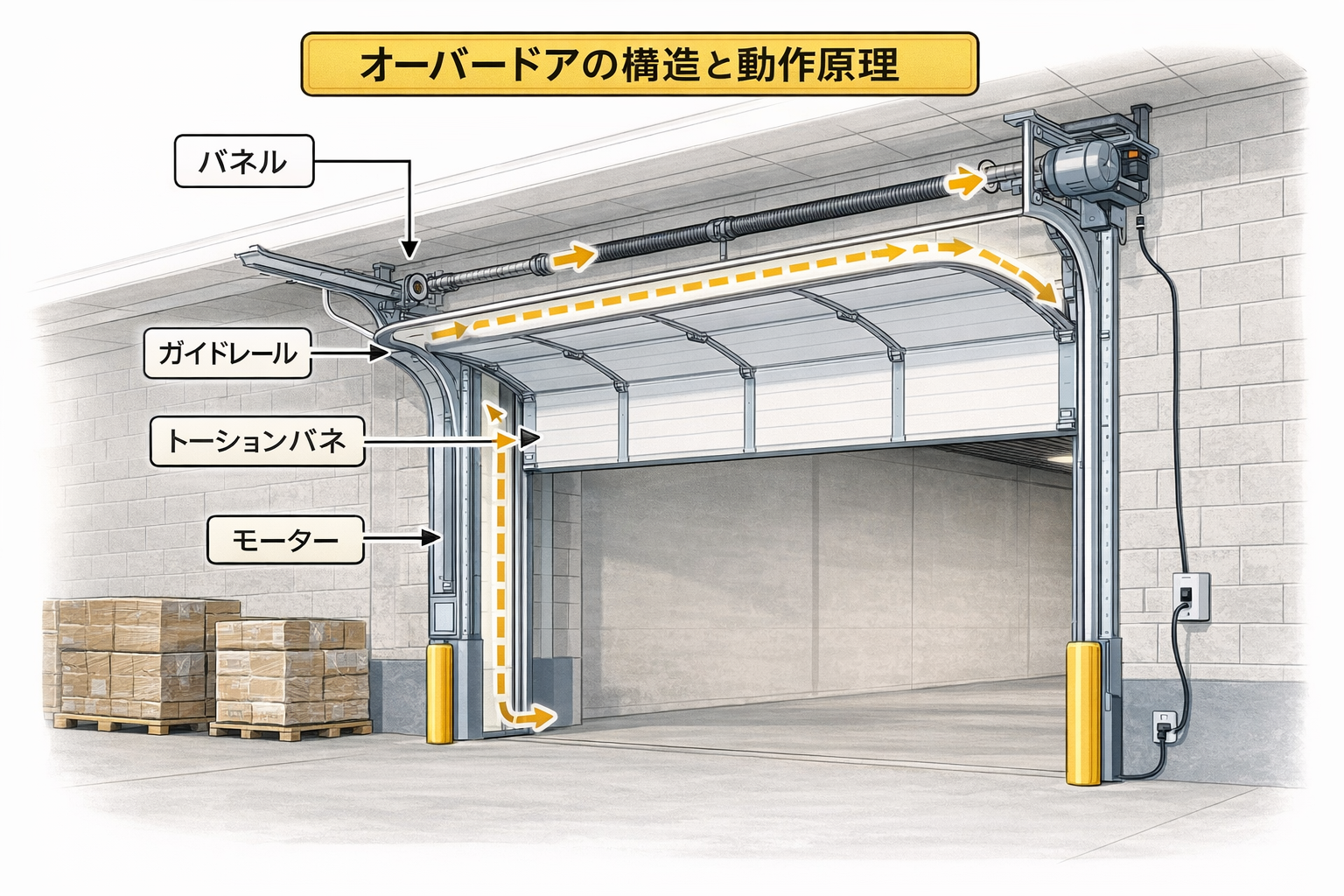 オーバードアとは、パネル状のドアが天井に沿って上方にスライドして開閉する大型の開閉設備です。「オーバーヘッドドア」とも呼ばれ、工場、倉庫、物流センター、消防署、大型ガレージなど、大きな開口部を持つ建物に広く設置されています。一般的な巻き上げ式シャッターとは開閉方式が異なり、複数のパネル(セクション)がヒンジで連結され、天井のレールに沿って折れ曲がりながら上昇する構造が特徴です。外観はシンプルで工業的な印象ですが、内部には精密な力学設計が組み込まれており、安全性と耐久性の両面で高い技術水準を実現しています。
