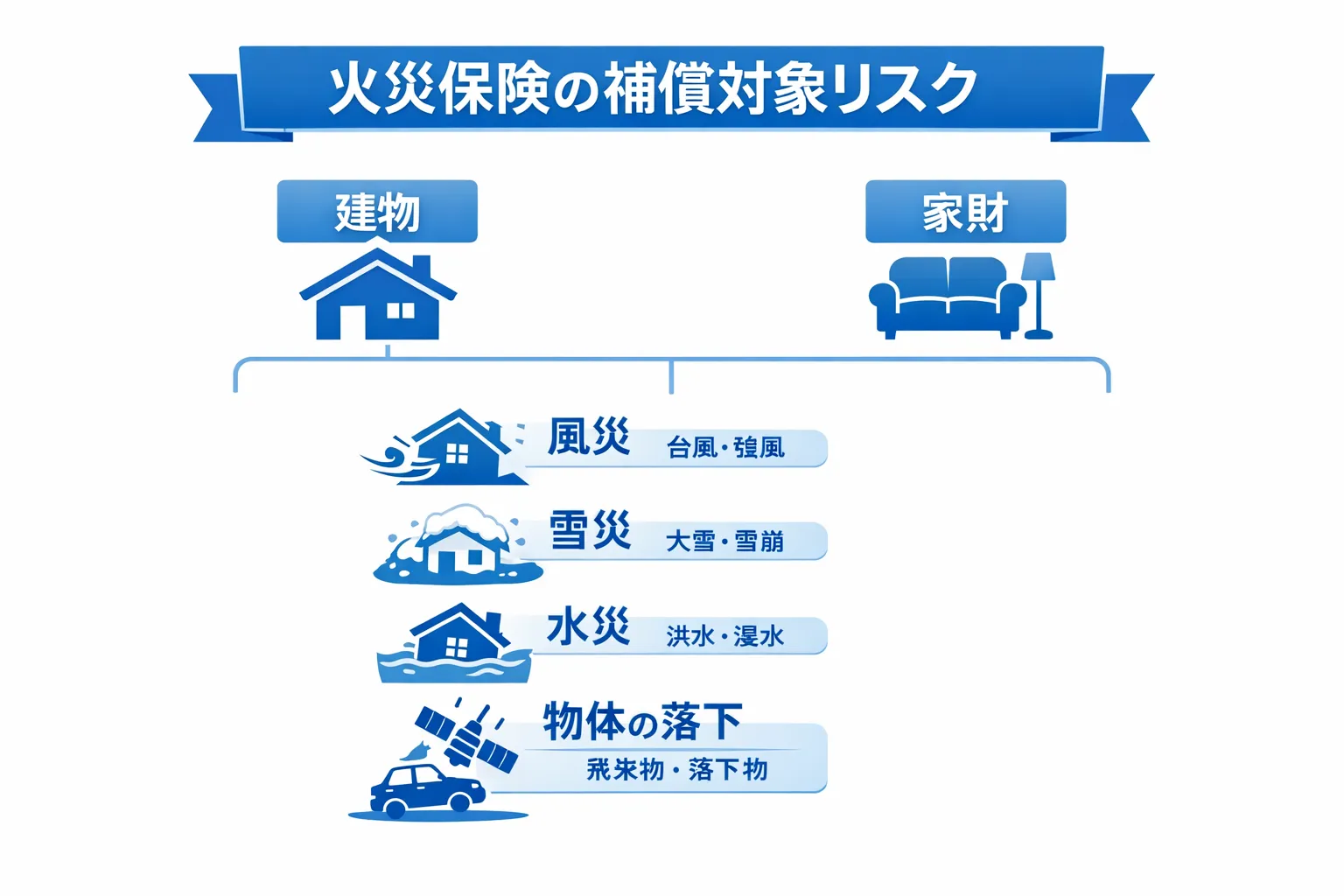 | 風災 | 台風・暴風・強風など風を原因とする損害。火災保険の補償対象として含まれるケースが多い。 |