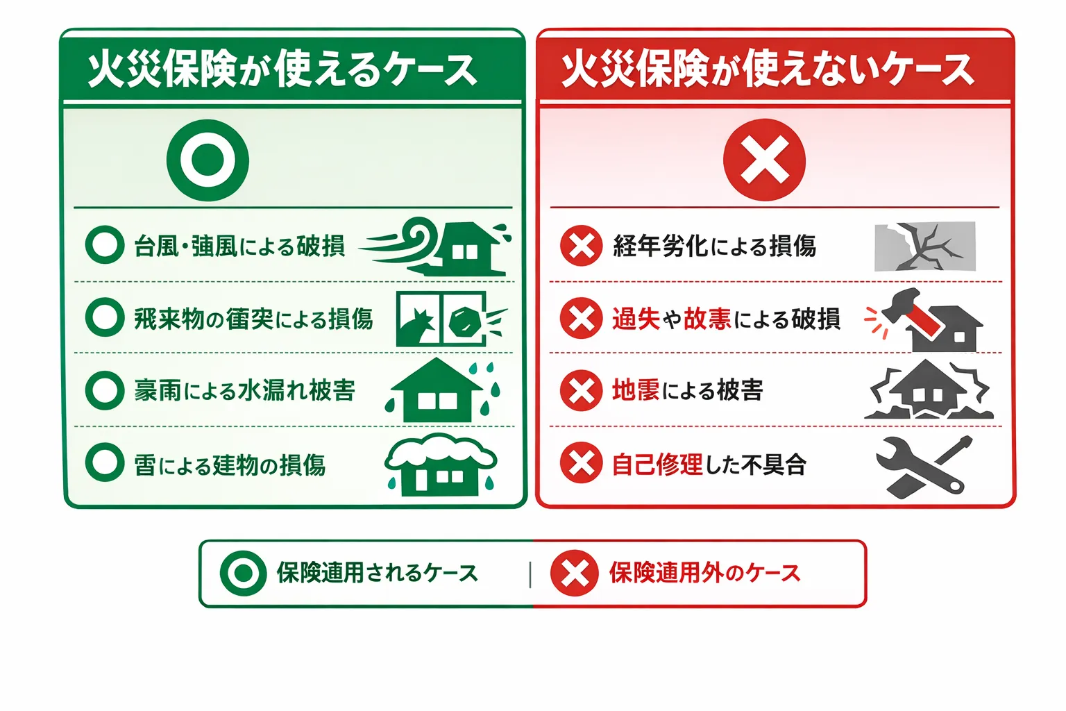 シャッター修理に火災保険が活用できるかどうかは、「損害の原因」によって決まります。台風・強風・飛来物・積雪・雹・車両衝突などを原因とする損害であれば、保険が適用される可能性があります。一方、経年劣化・消耗による故障や、地震による損害は補償対象外となります。